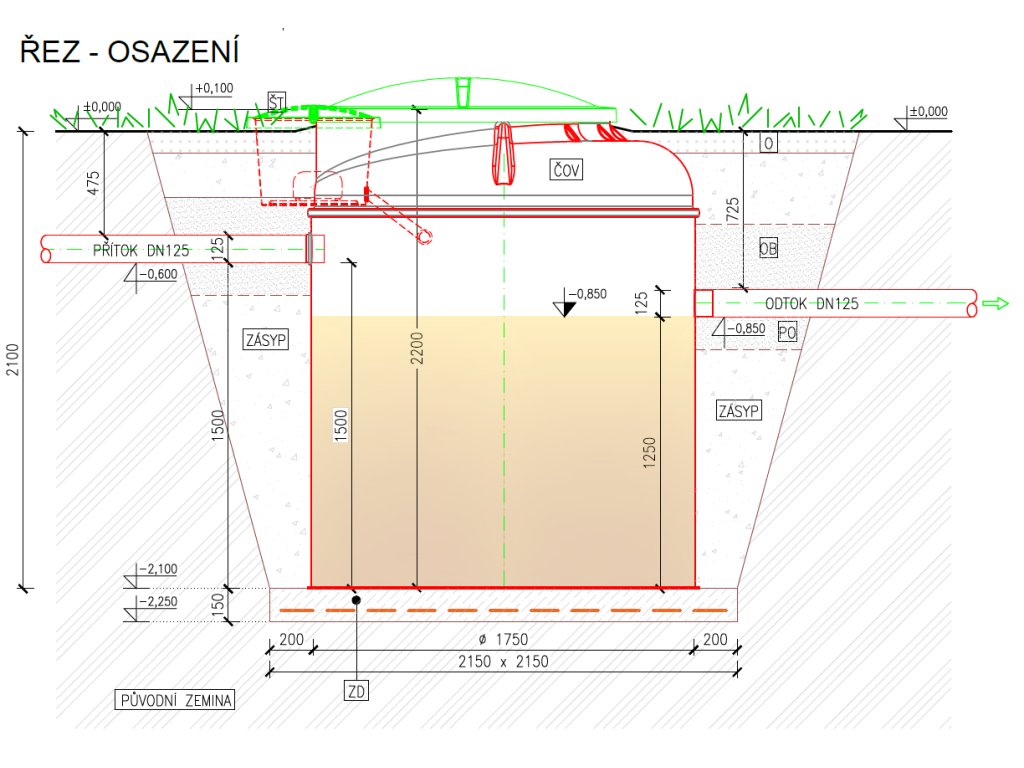 - výška přítoku 1500 mm (pokud je odpadní potrubí ve větší hloubce, lze ČOV vybavit nástavcem v potřebné výšce)