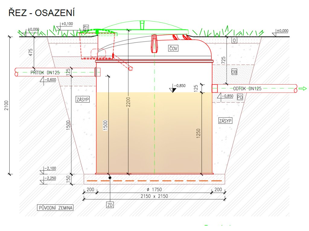 - výška přítoku 1500 mm (pokud je odpadní potrubí ve větší hloubce, lze ČOV vybavit nástavcem v potřebné výšce)