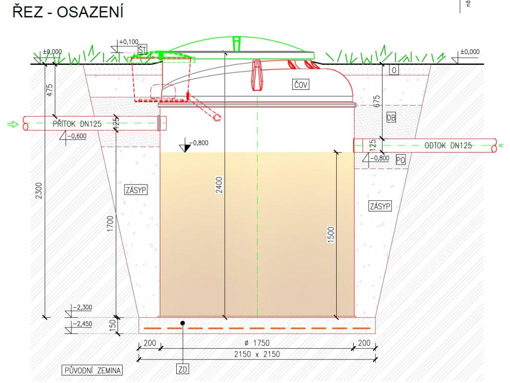 - výška přítoku 1700 mm (pokud je odpadní potrubí ve větší hloubce, lze ČOV vybavit nástavcem v potřebné výšce)