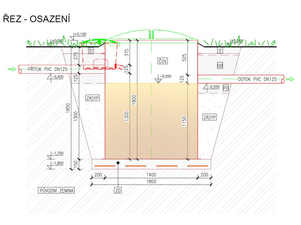 - výška přítoku 1300 mm (pokud je odpadní potrubí ve větší hloubce, lze ČOV vybavit nástavcem v potřebné výšce)