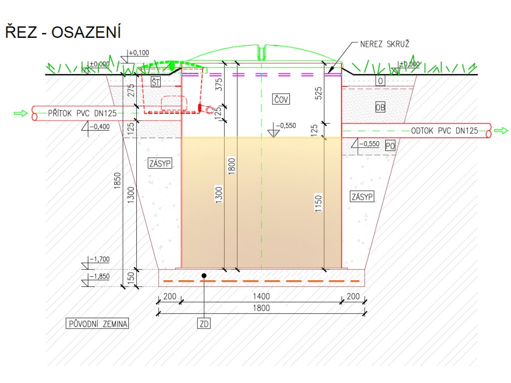 - výška přítoku 1300 mm (pokud je odpadní potrubí ve větší hloubce, lze ČOV vybavit nástavcem v potřebné výšce)
